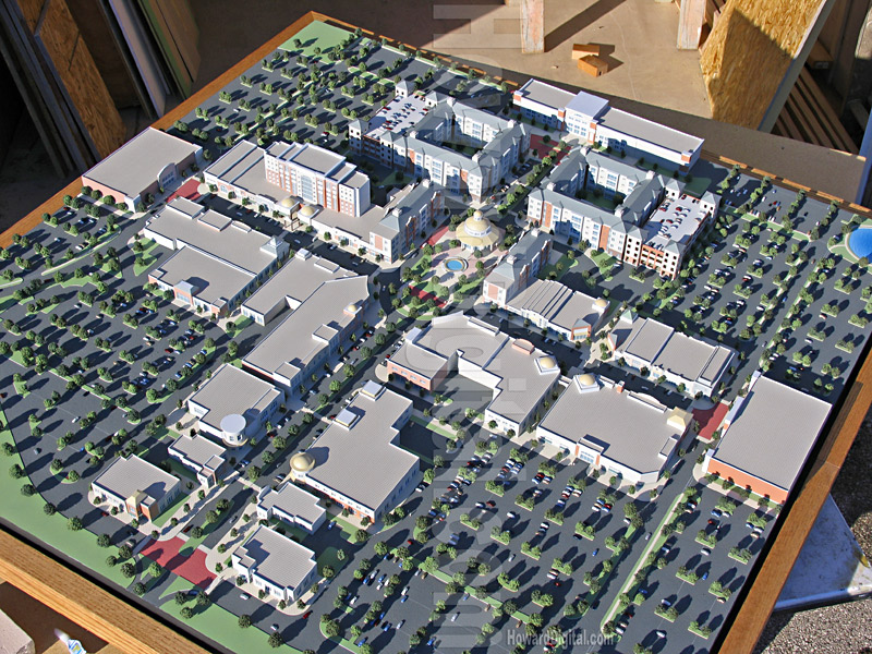 Pearland Travel - Howard Architectural Models, Architectural ModelPearland Site: Machine cut, hand finished, painted with grass, roads, walks, water features, landscaping, cars & people. Landscaping: large and medium trees with accurate shrubbery per the landscape plan. Water features: pools and fountains modeled to simulate depth and texture. Buildings: Full color detailed laser cut acrylic buildings. |