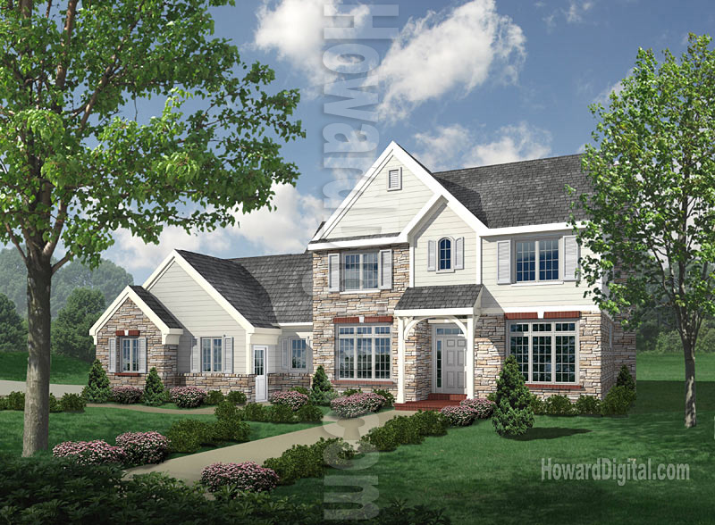 Residential single family house renderings for developers and home builders from Howard Digital. After ordering your house renderings and illustrations from Howard Digital, we will begin 3d modeling the homes from the floor plans and elevations you supply. We will send you views to choose from or give us feedback from which we will generate additional views to send you.
